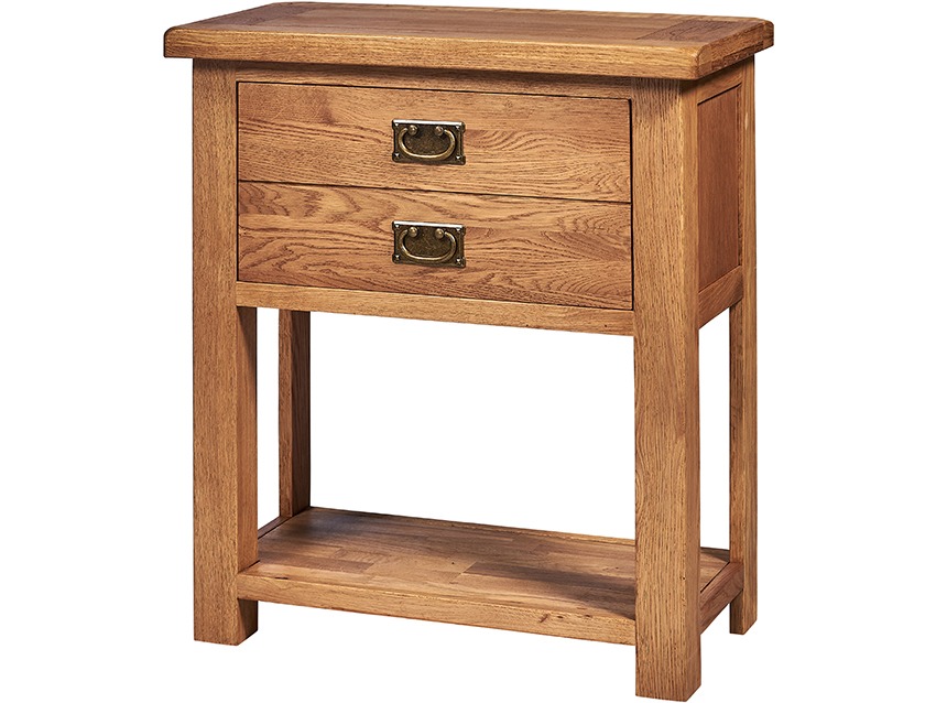 Solid oak Oiled finish - accentuating the natural oak grain Solid frame Round over edge profile on the top Drop pull handles with antique finish 1 drawer with dovetailed joints 1 shelfProduct Specification