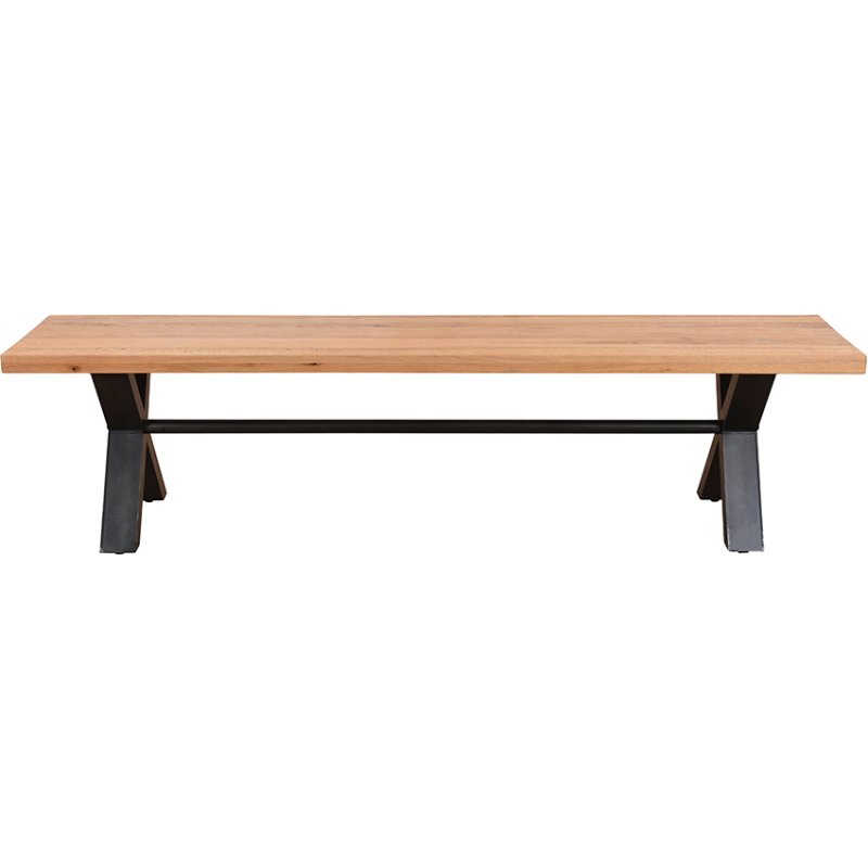 The Yukon 140cm wood top bench pairs an oiled oak veneer seat with black steel cross legs, ideal for dining rooms, kitchens, hallways or the end of a bed.