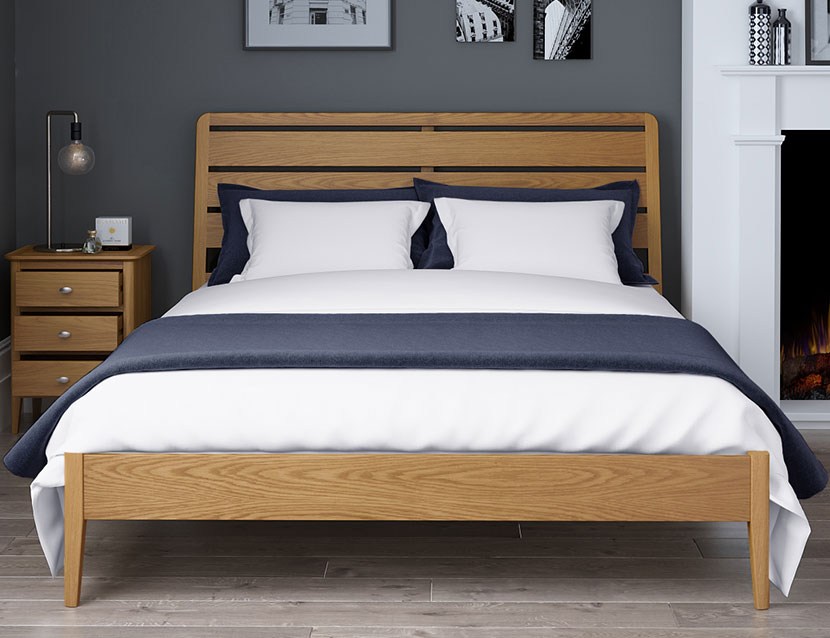 Subtle yet sophisticated Crafted from oak and oak veneers Brush oval handle for contrast and style Modern oak finish best paired with creamy neutrals or earthy tones Clean lines and gentle curves define elegance Natural lacquer finish gives tops durability Offering of 3 different bed sizes, 2 sizes of bedsides, 2 sizes of chests Plenty of stylish and flexible bedroom storageProduct Specification
