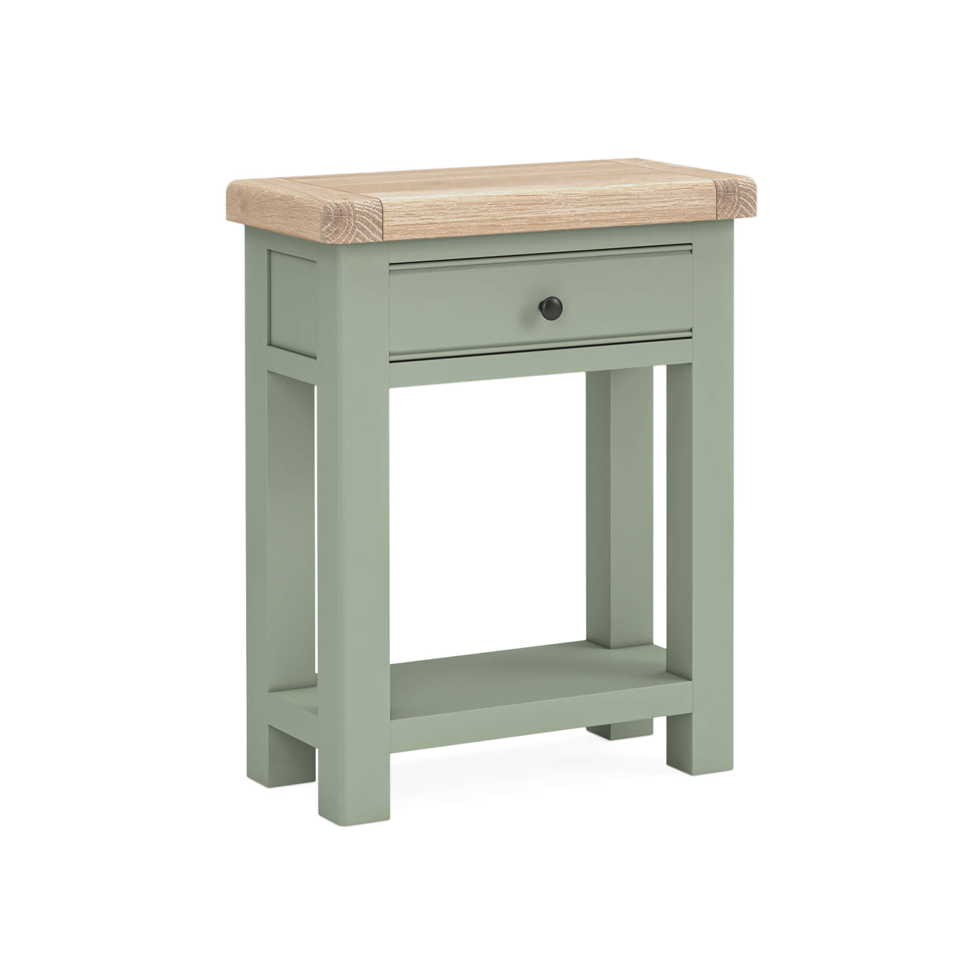 The Coastal Sage Telephone Table is a stylish and practical occasional piece designed to bring classic character and everyday function to the home. Using the matched Salcombe range for sourcing, it features a soft sage painted finish with contrasting oak tops, creating a calm, relaxed look that works beautifully in both traditional and more contemporary interiors. Across the Salcombe collection, the oak tops are finished in a durable white wash oil, giving the range a softer aesthetic, while the chunky proportions help it sit comfortably between classic and modern styling. As a telephone table, it offers a useful surface for a lamp, decorative accessories or everyday essentials, with practical storage that makes it especially useful in a hallway, landing or living space.