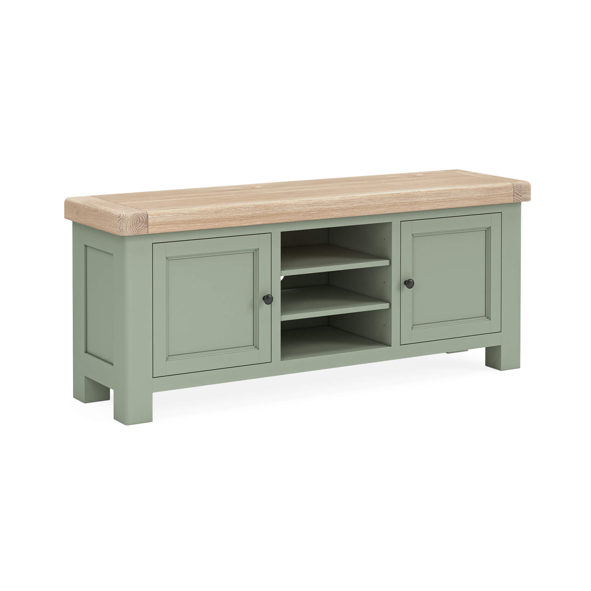 The Coastal Sage TV Unit 1400 is a stylish and practical living room piece designed to bring classic character and everyday function to the home. Using the matched Salcombe range for sourcing, it features a soft sage painted finish with contrasting oak tops, creating a calm, relaxed look that works beautifully in both traditional and more contemporary interiors. The oak tops are finished in a durable white wash oil, giving the piece a gentle, understated aesthetic while still allowing the natural beauty of the wood to show through. The collection is designed to bridge the gap between traditional and contemporary interiors, with chunky proportions and generous storage that help give it a reassuringly solid, timeless feel. As a 140 cm TV unit, it provides a practical surface for a television along with useful media storage to help keep the living space neat and organised.