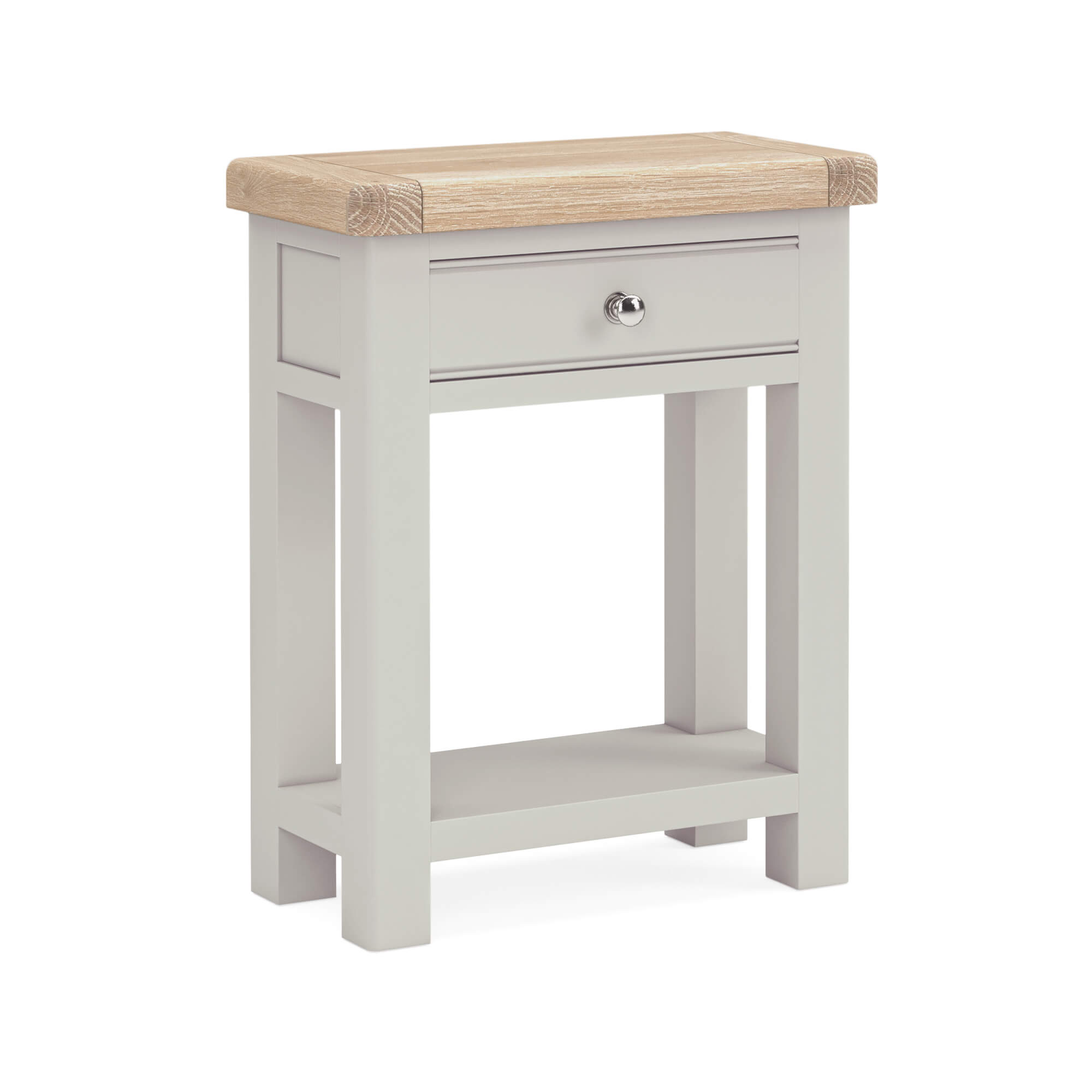 The Coastal Stone Grey Telephone Table is a stylish and practical occasional piece designed to bring classic character and everyday function to the home. Using the matched Salcombe range for sourcing, it features a soft stone grey painted finish with an oak top, creating a calm, relaxed look that works beautifully in both traditional and more contemporary interiors. The oak top is finished in a durable white wash oil, giving the piece a gentle, understated aesthetic while still allowing the natural beauty of the wood to show through. The collection is designed to bridge the gap between traditional and contemporary interiors, with chunky tops and legs and generous proportions that give it a reassuringly solid, timeless feel. It also comes with a choice of two handle styles, a chrome knob or a smaller antique gold knob. As a telephone table, it offers a useful surface for a lamp, decorative accessories or everyday essentials, with practical storage that makes it especially useful in a hallway, landing or living space.