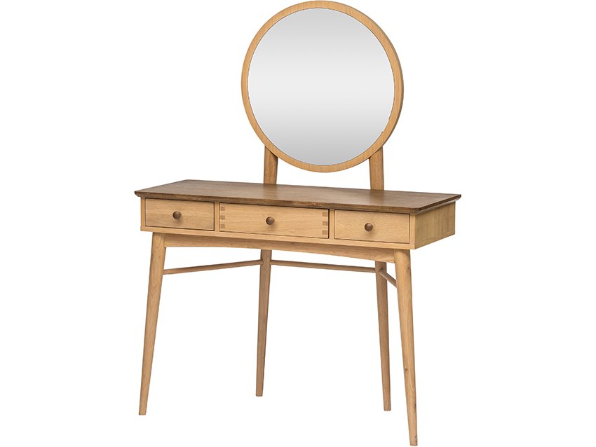 Oak and oak veneers Rustic look Two tone finish Round tapered legs Rounded corners Reverse bevel edge Round mirror 3 drawers Matches the Marvic dressing table stoolProduct Specification