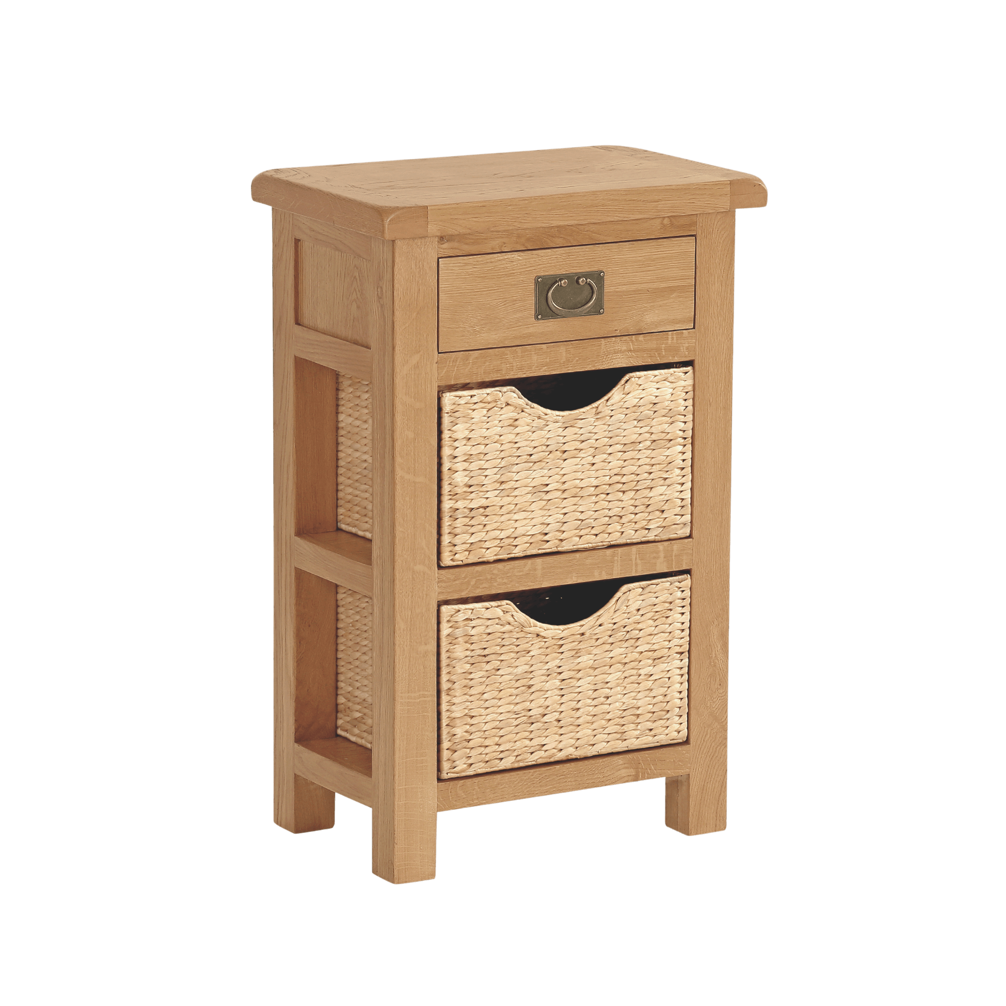 A charming rustic oak side table ideal for small spaces. The compact design with two woven baskets and a drawer offers clever storage while the natural oak finish adds warmth and timeless appeal.