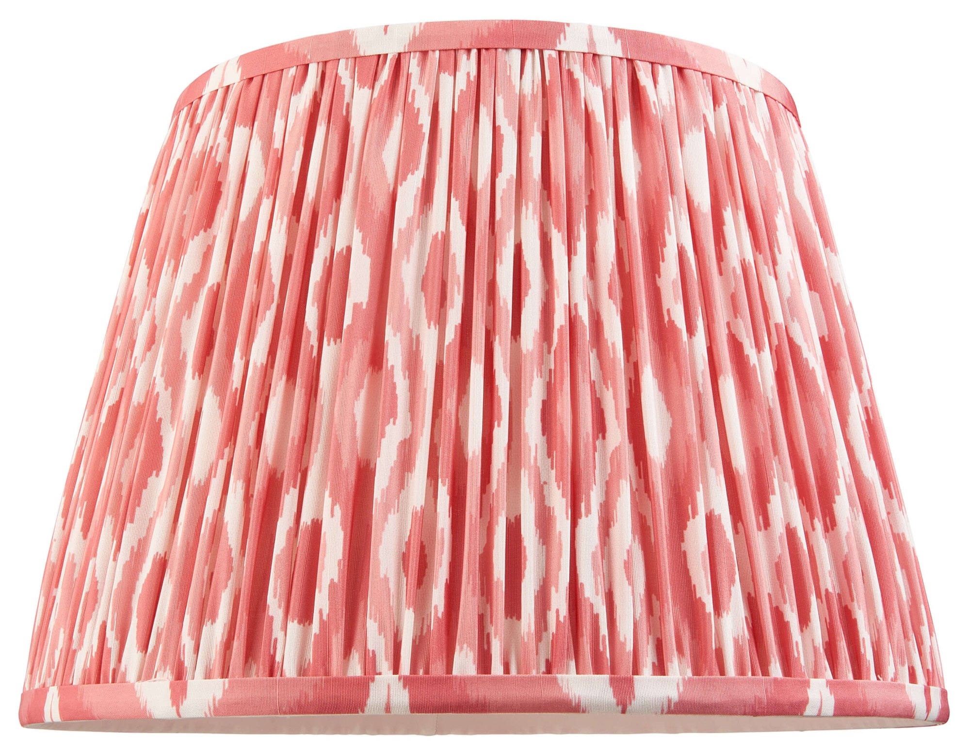 Add colour and pattern to your lighting scheme with this tapered lampshade, featuring a distinctive Ikat-inspired design in coral pink. Finished with taped edge detailing and a plain inner lining, it brings a decorative touch to table lamps and floor lamps.
