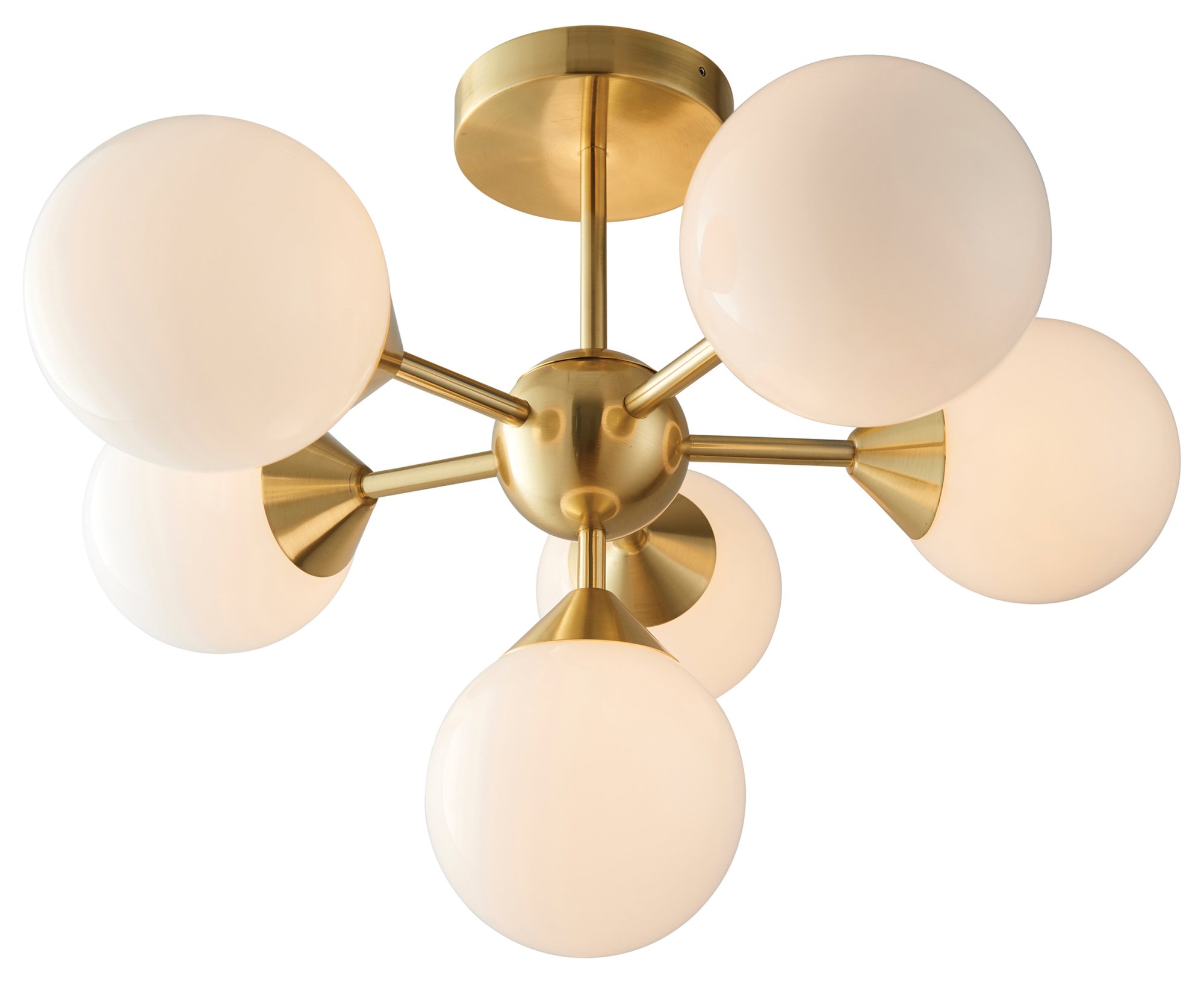 The Oscar Ceiling Light combines timeless mid?century design with modern elegance. It features a brushed gold plated steel frame and six gloss white glass globes that provide soft diffuse light. This semi flush fixture suits rooms with lower ceilings while delivering generous illumination. It uses six G9 LED bulbs of up to 3?W each. It is dimmable when used with suitable bulbs and a compatible dimmer switch. Rated IP20 and Class?I earthed. It comes complete with all mounting accessories and includes a two year manufacturer warranty.