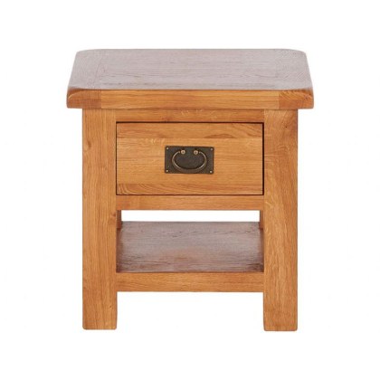 Compact solid oak lamp table with handy lower shelf, ideal beside your sofa or bed for a lamp, drinks and decor in a warm mid century modern style.