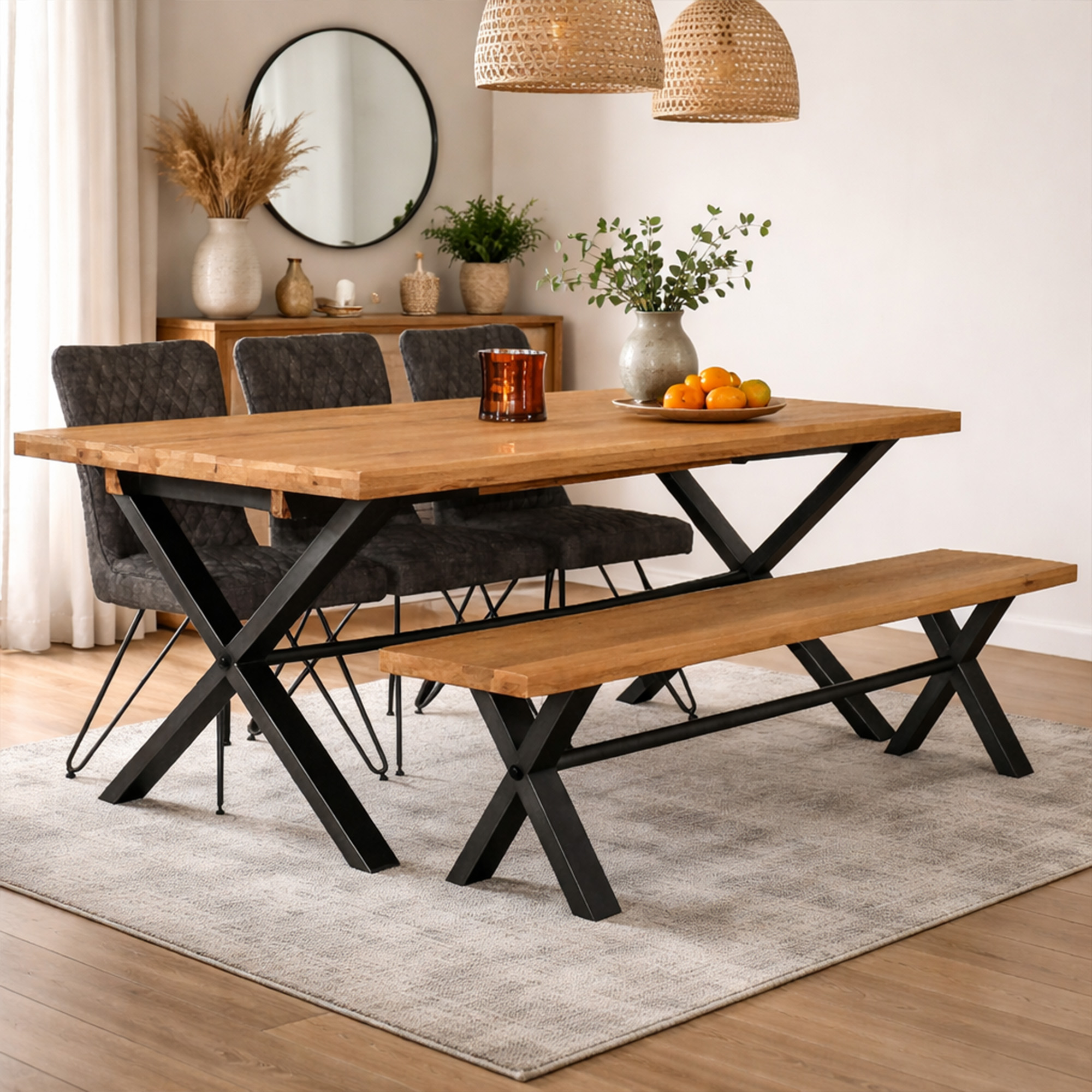 The Yukon 190cm Dining Table features a chunky solid oak top with an oiled finish that enhances the natural grain while providing lasting protection. Supported by striking black steel cross legs, the table brings contemporary industrial style to your home.